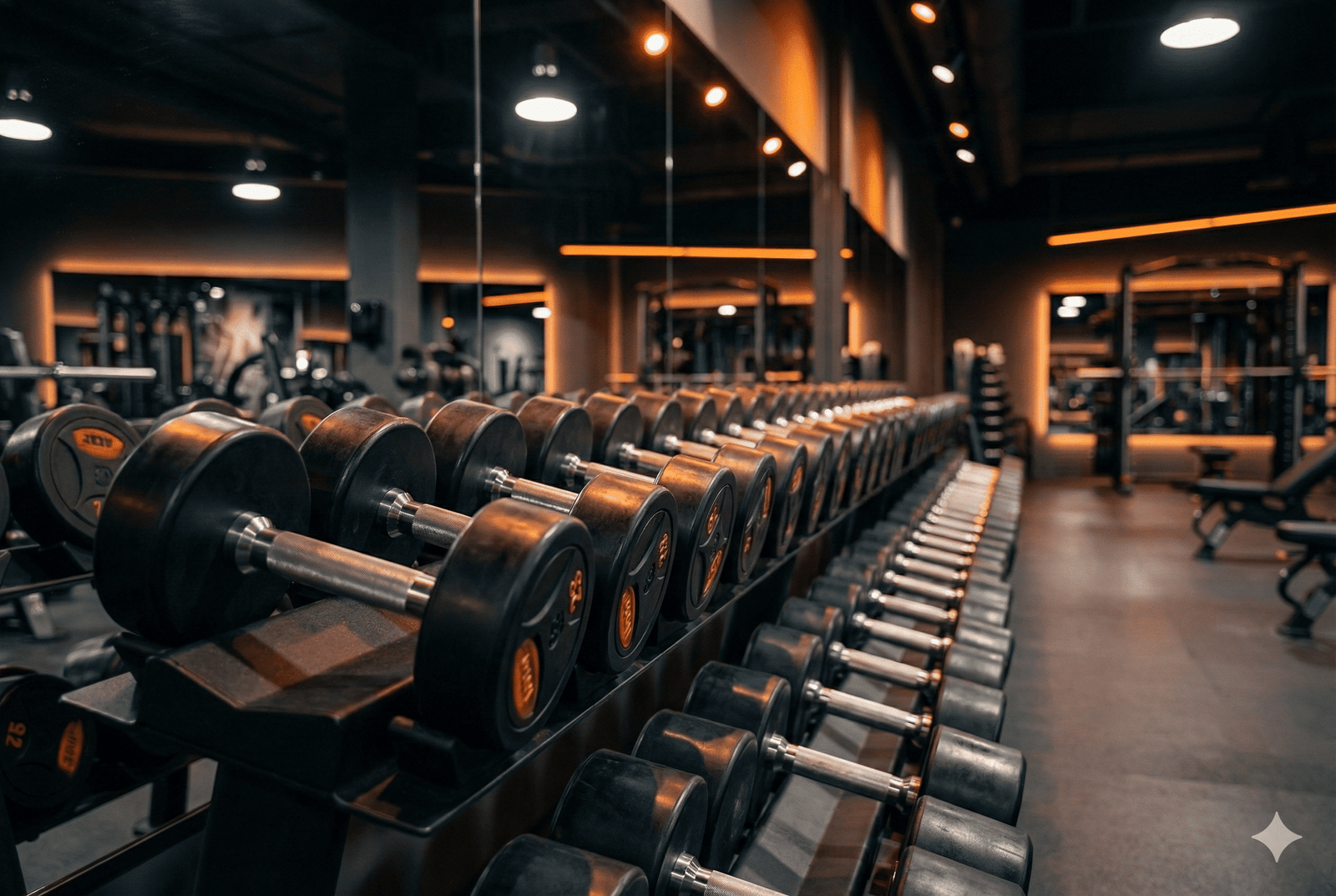 Zona de pesos livres e máquinas de alta performance para hipertrofia e força.